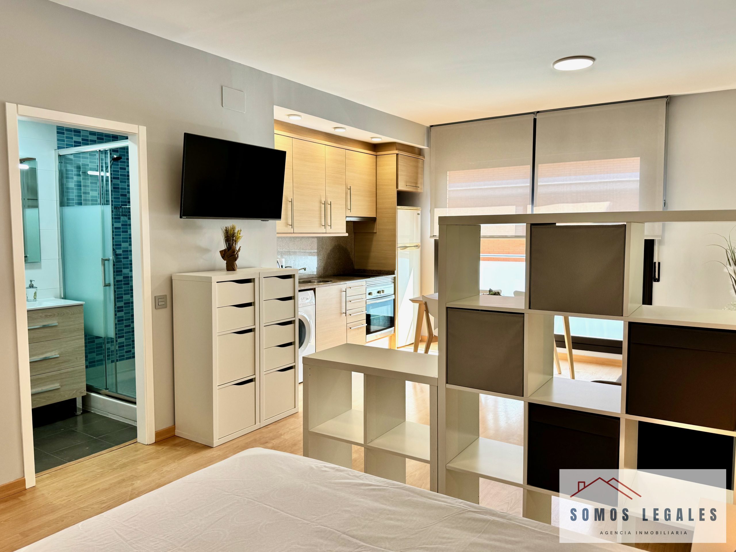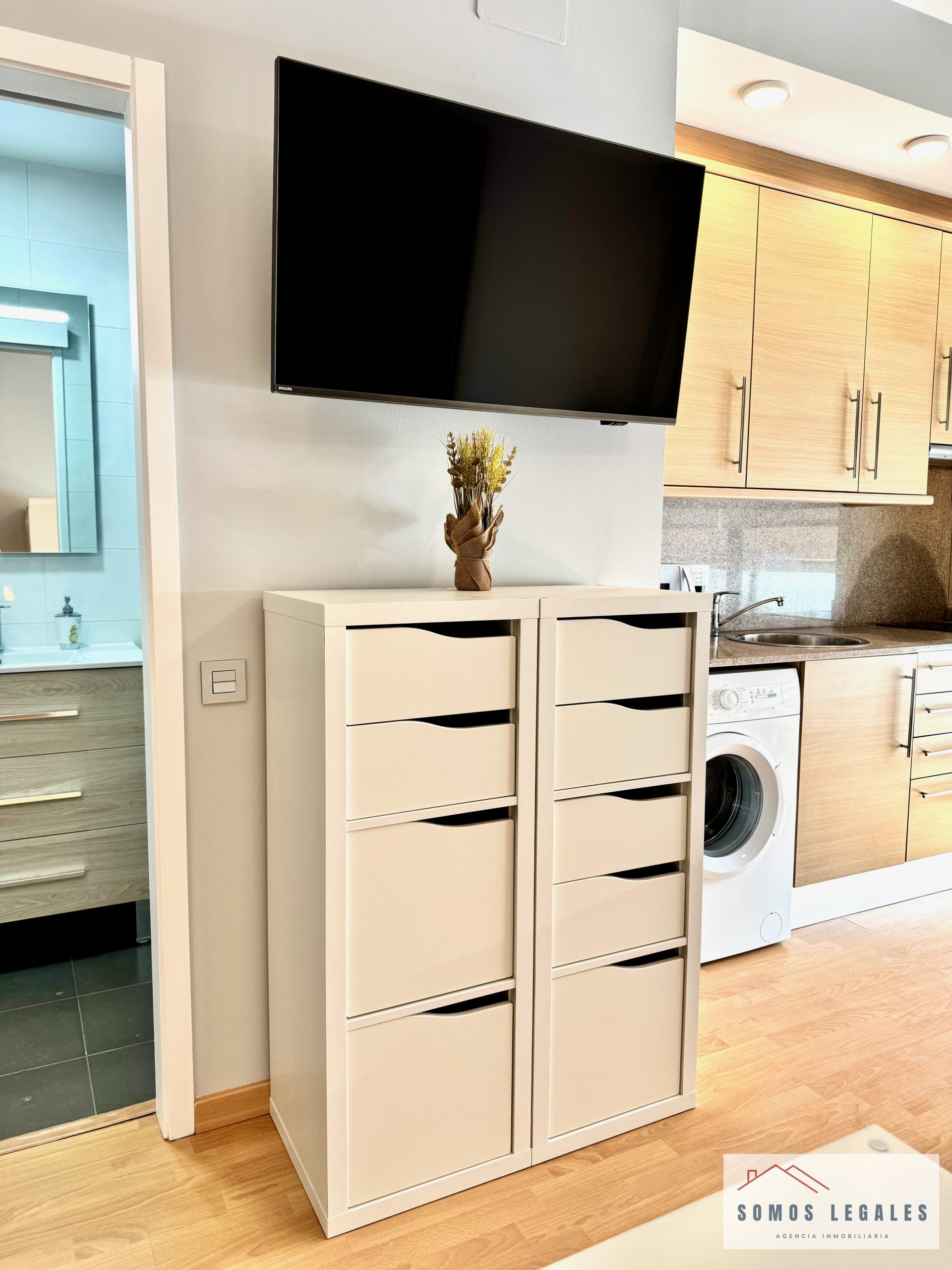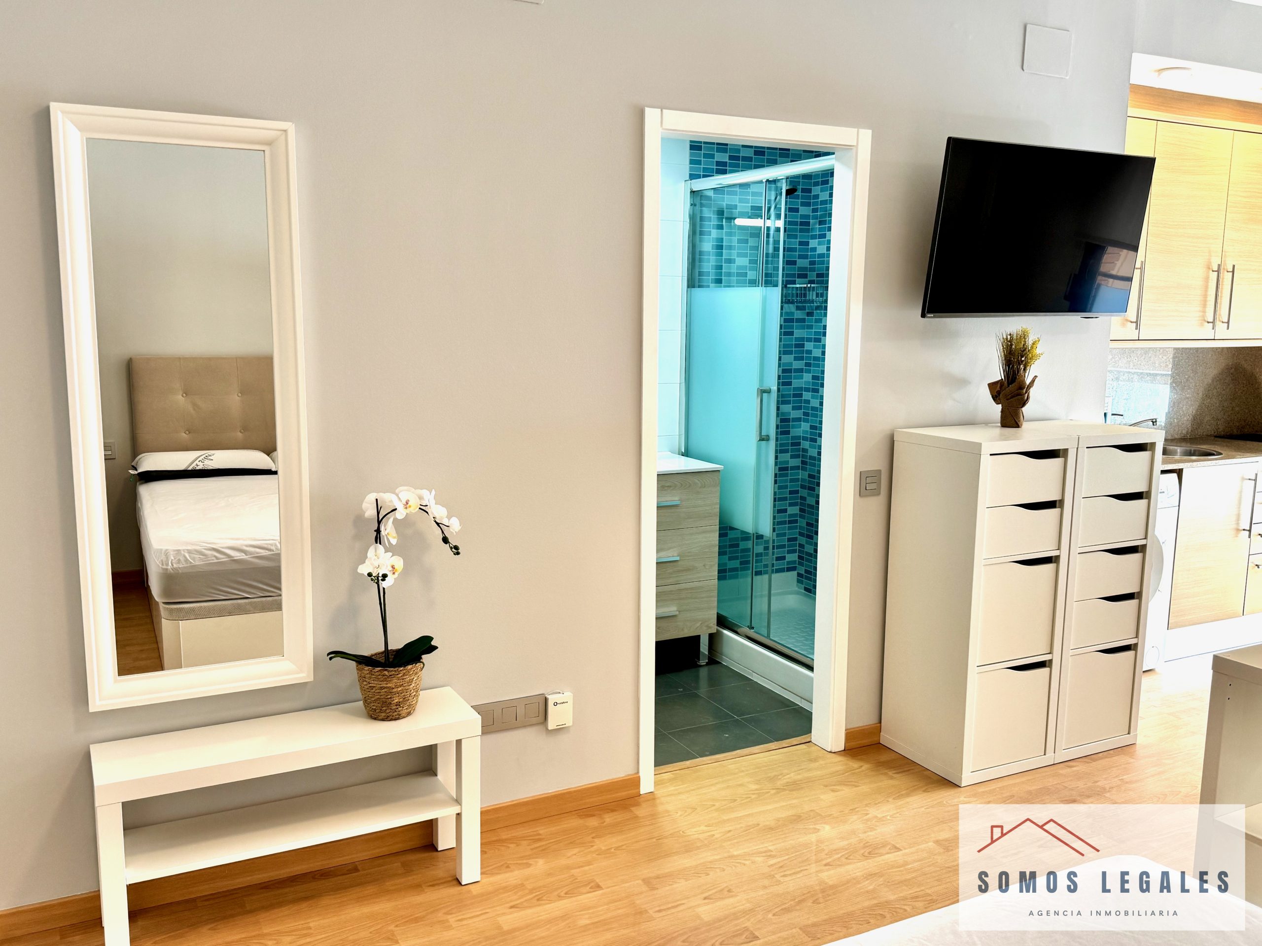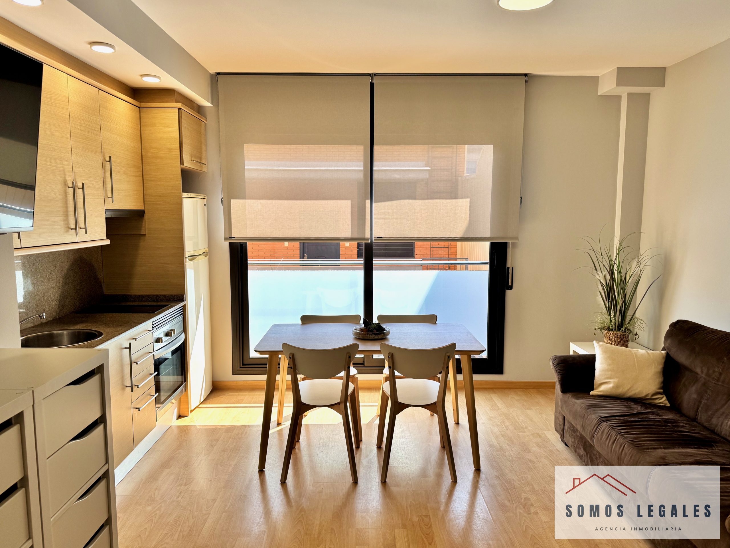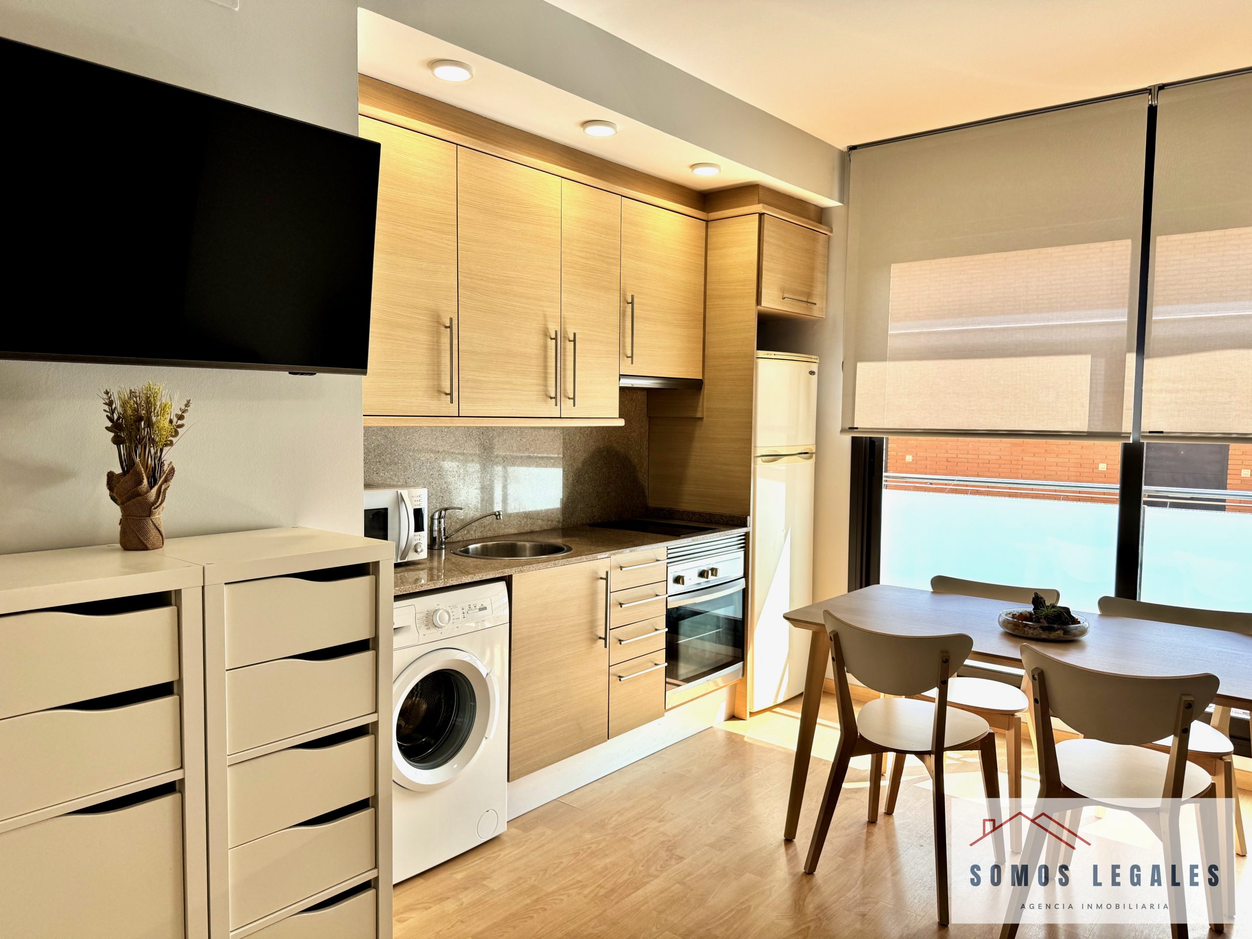 Dispone de zona salón-comedor con smart TV Philips 43″ y pequeño balcón, zona de dormitorio con amplios armarios empotrados y canapé abatible, cocina americana totalmente equipada con nevera, vitrocerámica, horno, microondas y lavadora, y baño independiente completamente reformado y equipado con plato de ducha con mampara y toallero eléctrico.