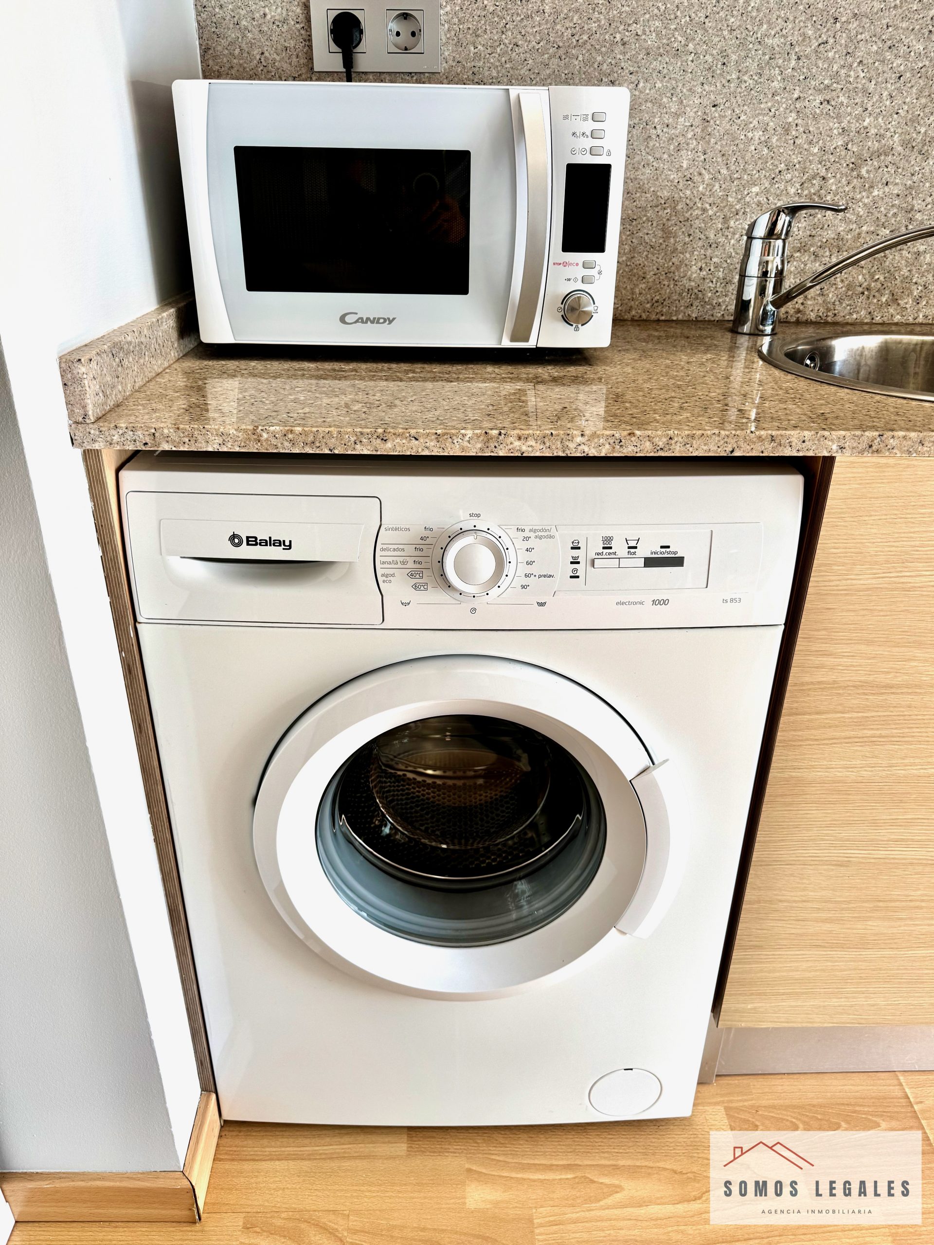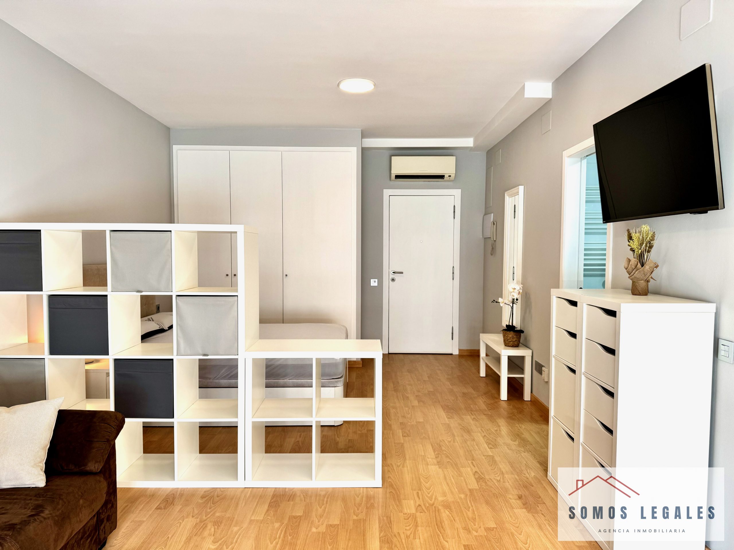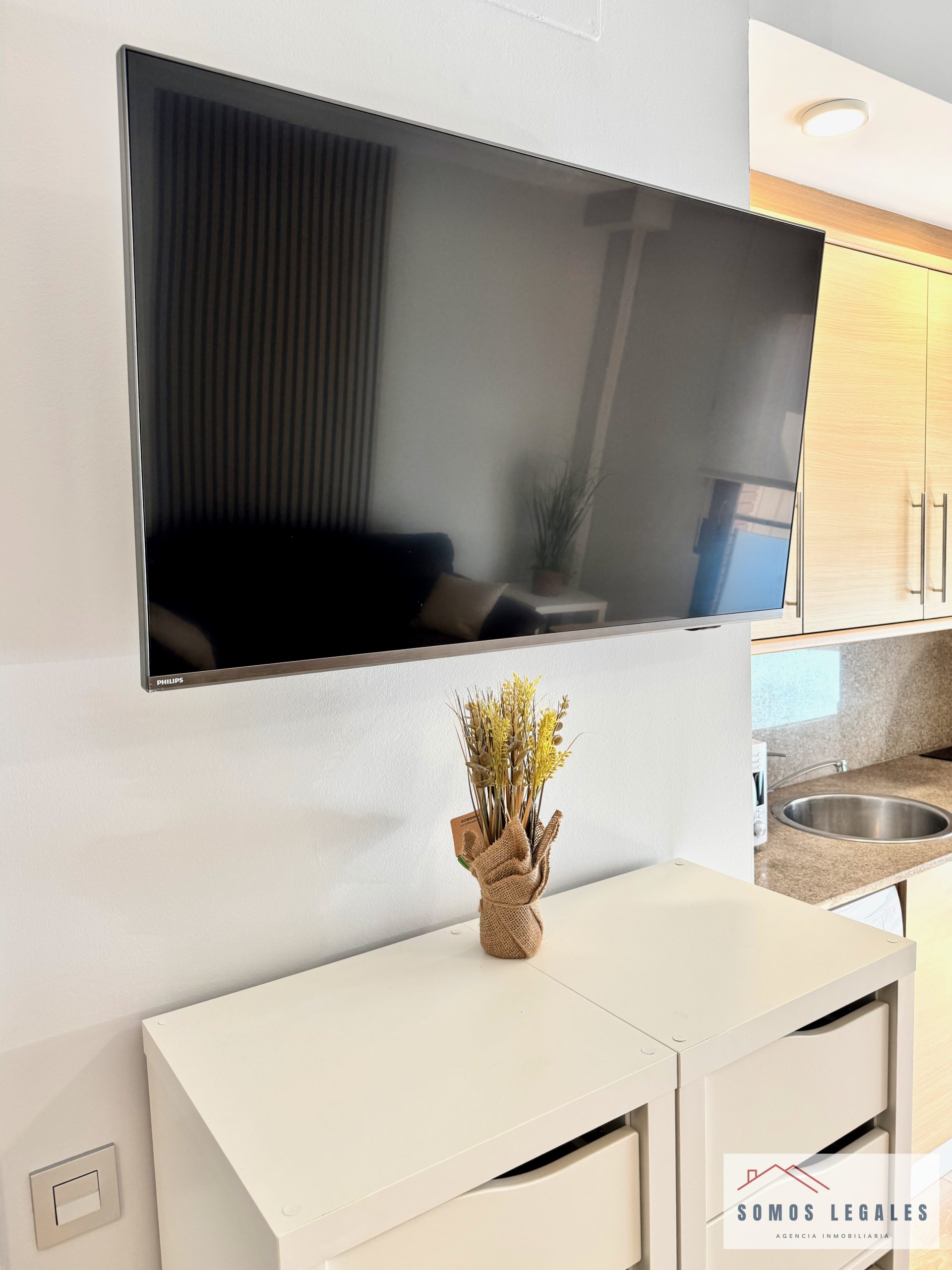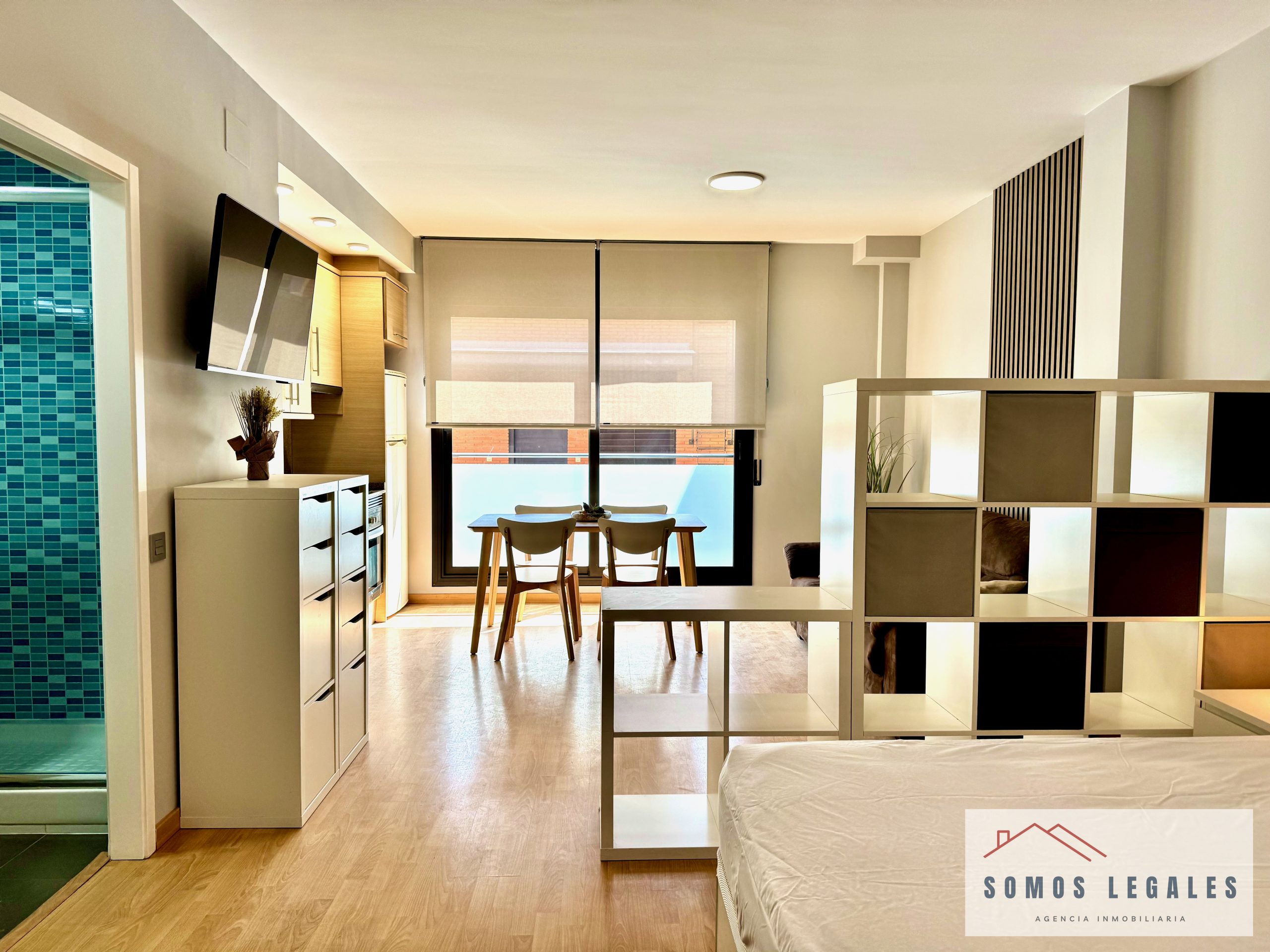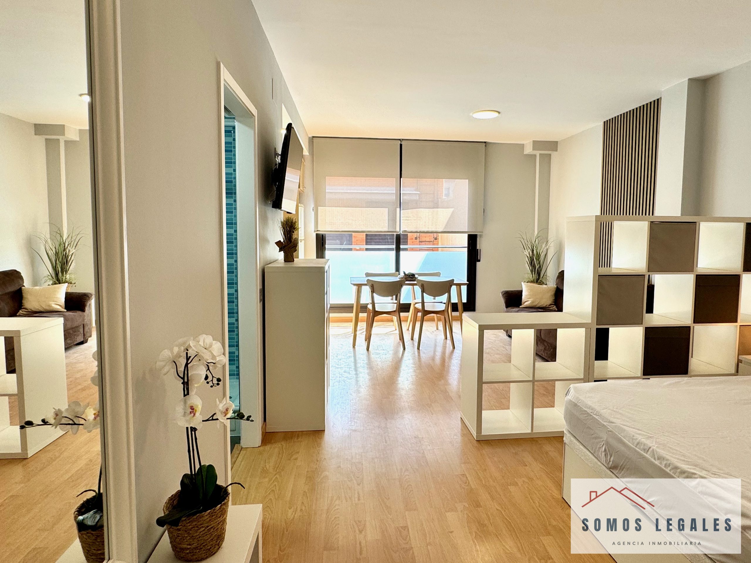 Dispone de zona salón-comedor con smart TV Philips 43″ y pequeño balcón, zona de dormitorio con amplios armarios empotrados y canapé abatible, cocina americana totalmente equipada con nevera, vitrocerámica, horno, microondas y lavadora, y baño independiente completamente reformado y equipado con plato de ducha con mampara y toallero eléctrico.